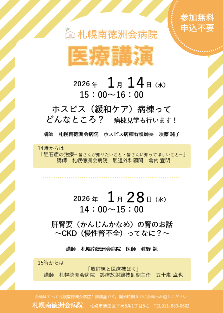 医療講演のお知らせ(1月14日、28日) 当院で行います医療講演、1月の予定をお知らせいたします。 1月14日(水)15時、1月28日(水)14時の日程で行います。どなたでも参加可能ですので是非お越しください。 詳細は下記の画像をご覧ください。