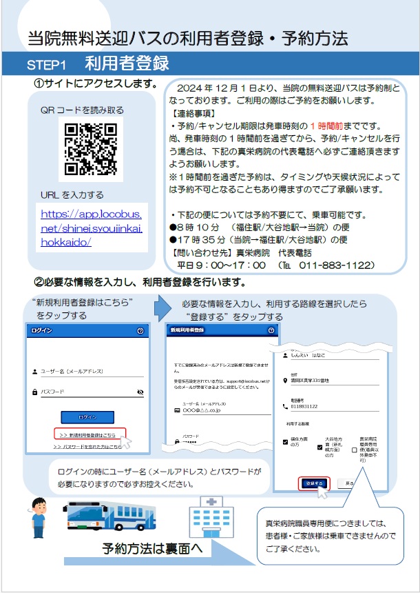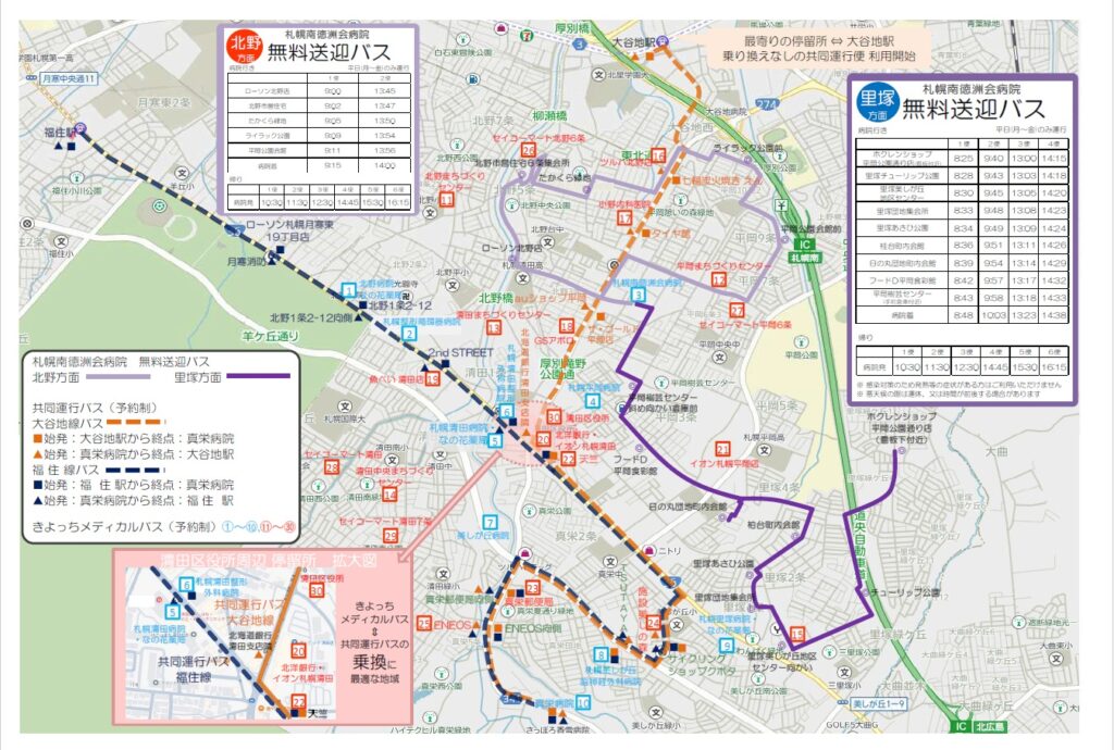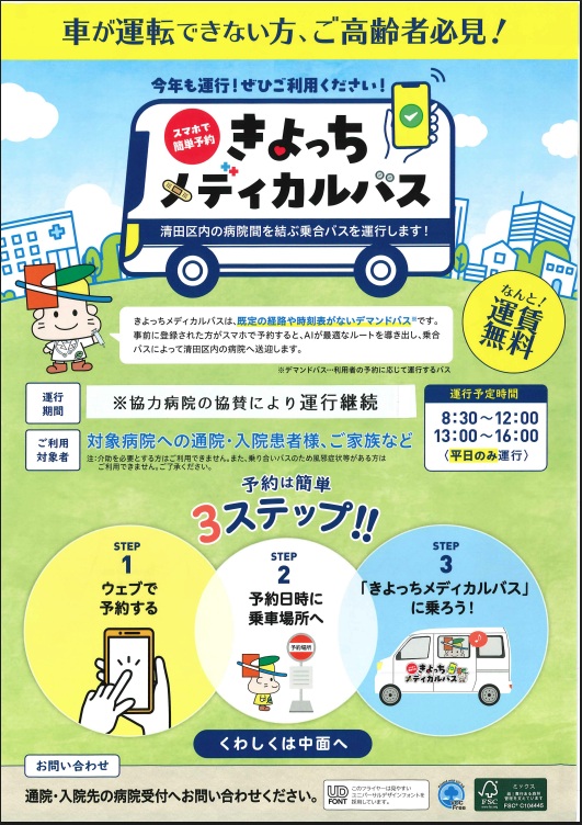 共同運行バスについてのお知らせ 4月より、真栄病院・美しが丘脳神経外科病院共同運行バスを当院ご利用の患者さん、ご家族さんも利用可能となります。詳しくは下記の各画像をクリックしてご確認ください。 ※共同運行バス、きよっちメディカルバスは利用者登録が必要になります。